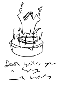 Another greeting card idea, this is the design sketch for the layout of Death Wishes You a ___th Birthday! I decided that the last thing anyone wanted to see on their birthday was... well... they last thing they would ever see. I might take it out and draw it up. It's a nice concept, Death popping out of a cake. Very "Some like it hot."